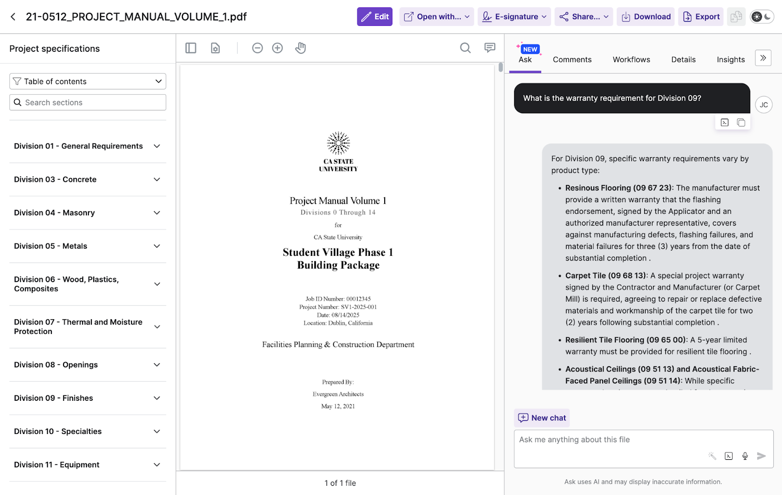 • Natural language Q&A so you can ask questions like, “What is the warranty requirement for Division 09?”